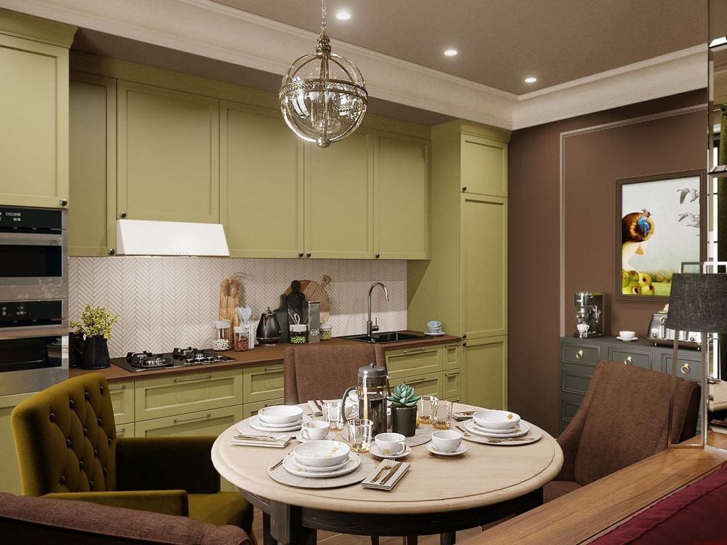 В гостиных и спальнях оливковый, хаки и болотный отлично сочетаются с цветом и фактурой натуральной древесины. Также эта комбинация хорошо выглядит на кухне. Стены сложного зеленого оттенка и деревянная мебель — настоящая классика жанра.