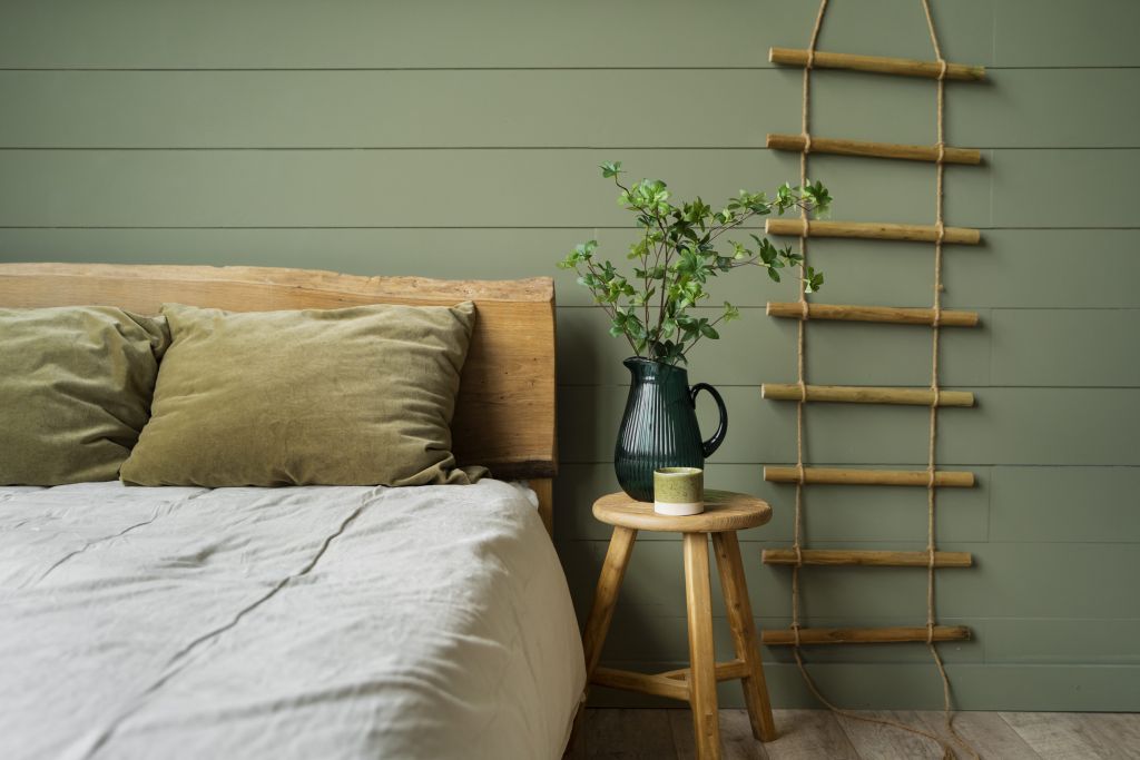 Сочетание оливкового цвета и дерева — один из самых популярных вариантов в спальнях